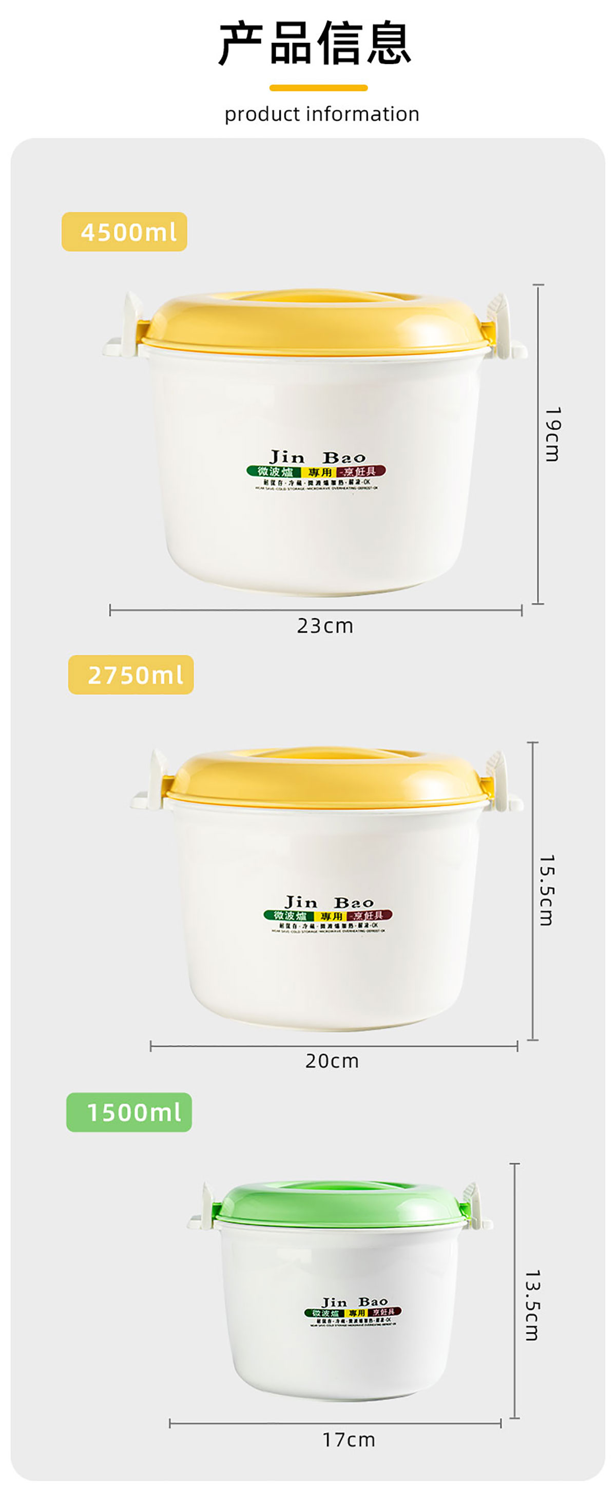Size: JB-235:170*135mm/1500ml JB-252:200*155mm/2750ml JB-271:230*190mm/4500ml